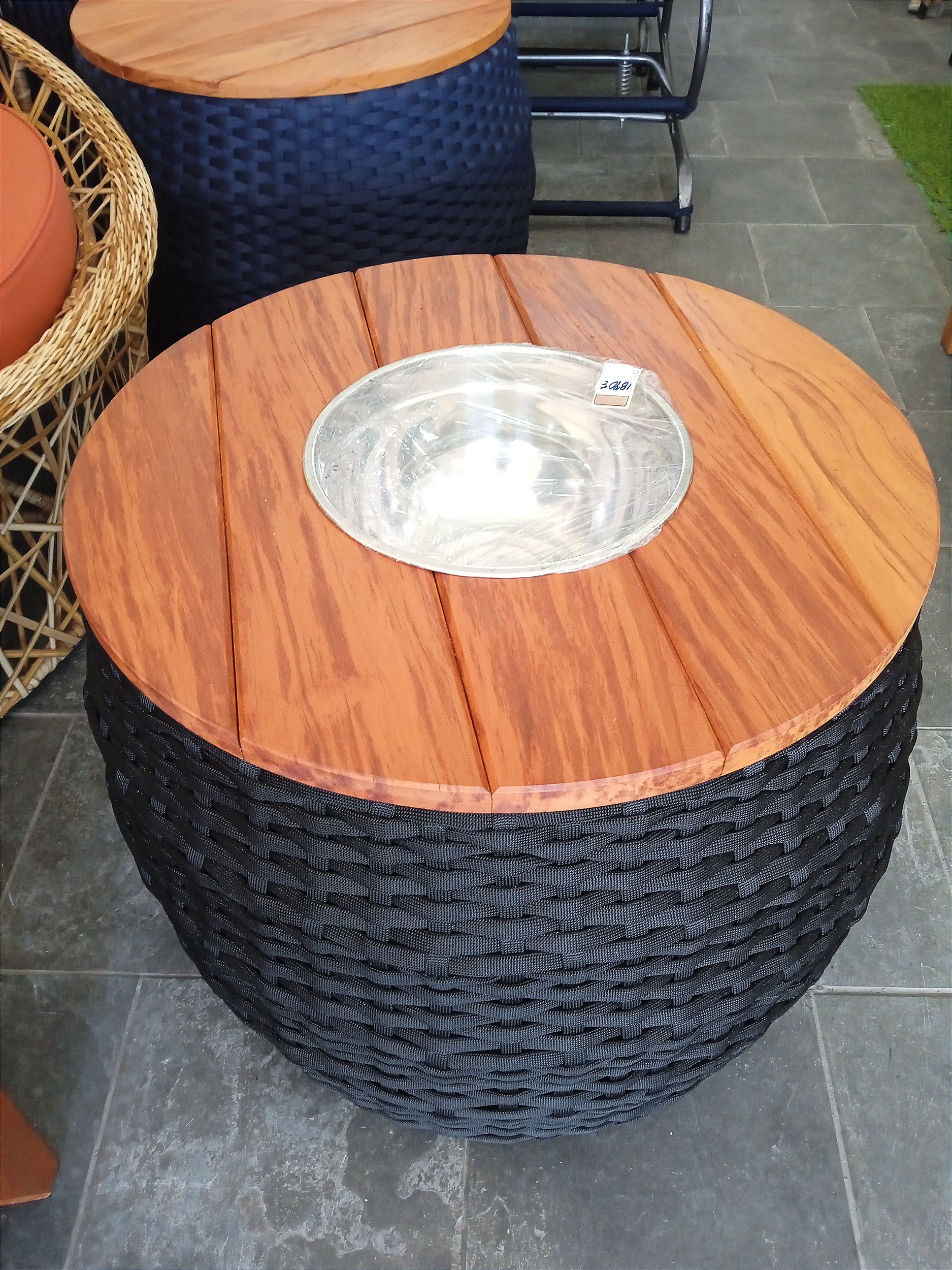 Champanheira confeccionada em alumínio tramada na corda náutica com opção de cores ,  tampo de madeira de construção .