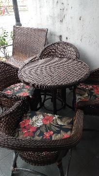 MESA CONFECCIONADA EM ALUMINIO DIAMETRO DO TAMPO DE VIME 80 CM POR 78 CM DE ALTURA TRAMADA NA FIBRA SINTETICA ARGILA ACOMPANHA 4 CADEIRAS .