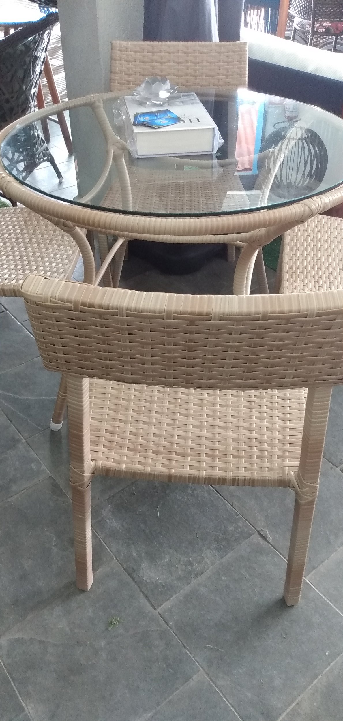 MESA REDONDA CONFECCIONADA EM ALUMINIO TAMPO DE VIDRO 90 CM TRAMADO NA FIBRA SINTETICA PALHA ACOMPANHA 4 CADEIRAS.